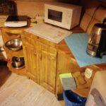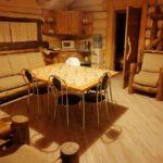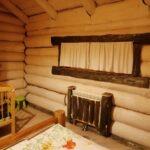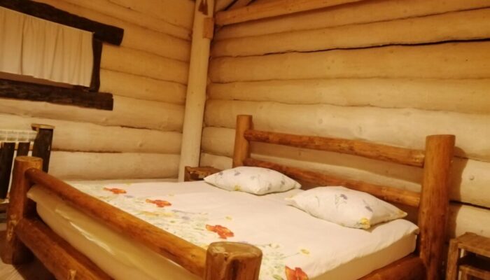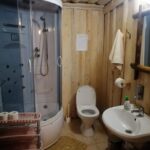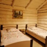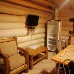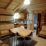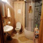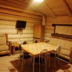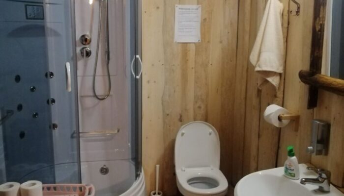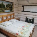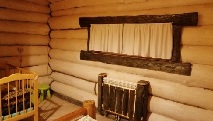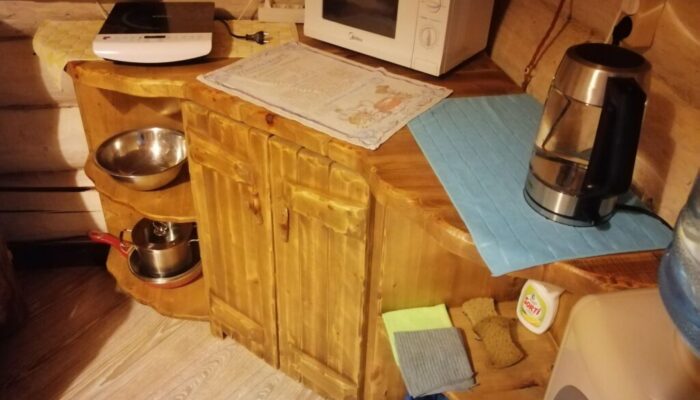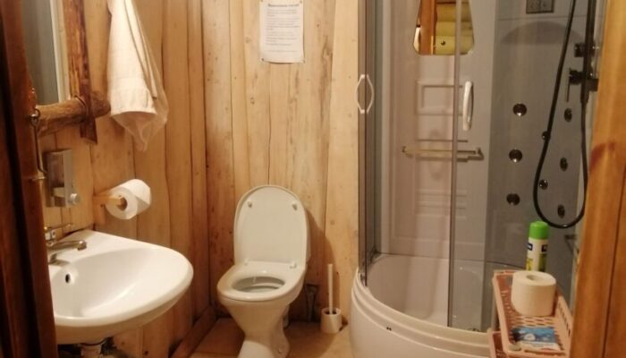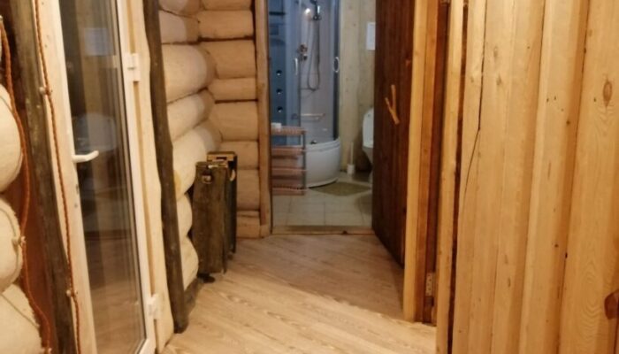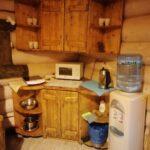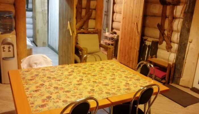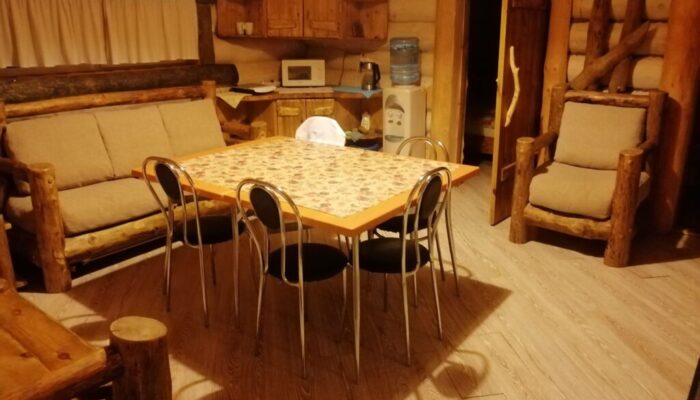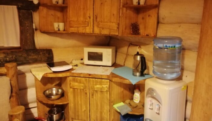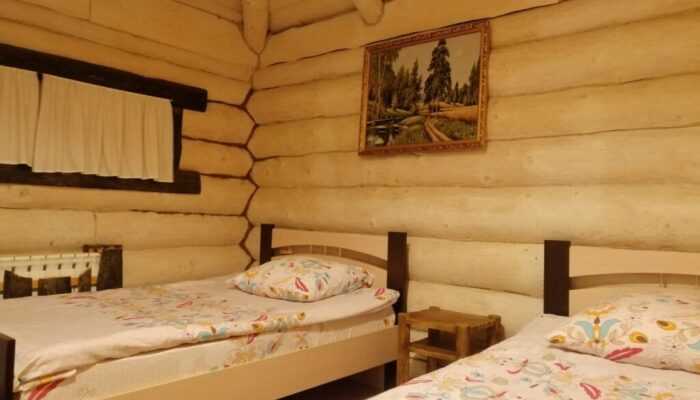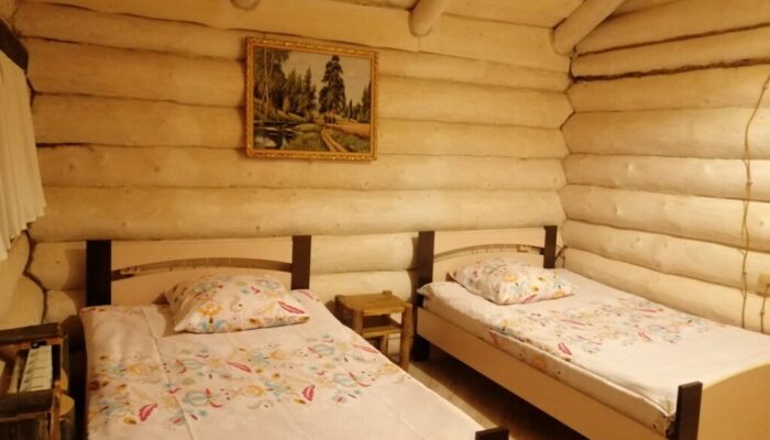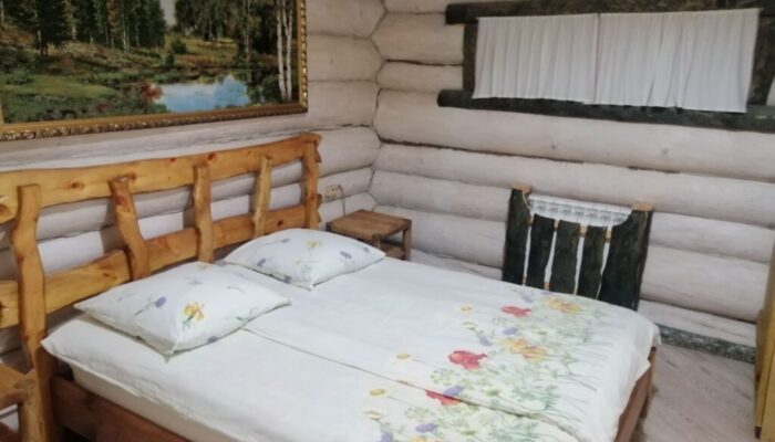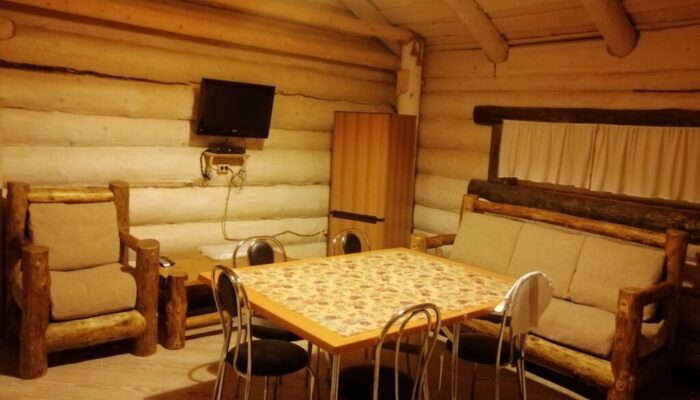 1-этажный дом — терем из цельных брёвен.Размещение — 6 человек. В тереме три отдельных спальни. Комната с большой — нестандартной двуспальной кроватью, комната с двуспальной кроватью, комната с двумя полутороспальными кроватями. Большой холл с мягкой мебелью; кулер с горячей, холодной питьевой водой; телевизор; большой холодильник; два кресла; два больших стола и стулья; минимальный набор необходимой посуды; микроволновая печь, индукционная плитка,электрический чайник, два отдельных санузла с душевыми кабинами; мангал около Терема.
